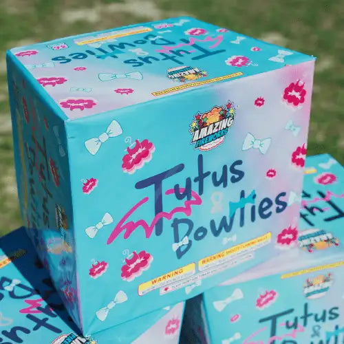 Make your gender reveal unforgettable with the Tutus & Bowties - Daytime 36 Shot Smoke Fan Cake with Cracking. This premium smoke cake delivers 36 vibrant bursts of pink or blue smoke in a fan-shaped pattern, accompanied by thrilling cracking effects that add excitement and drama to your reveal.